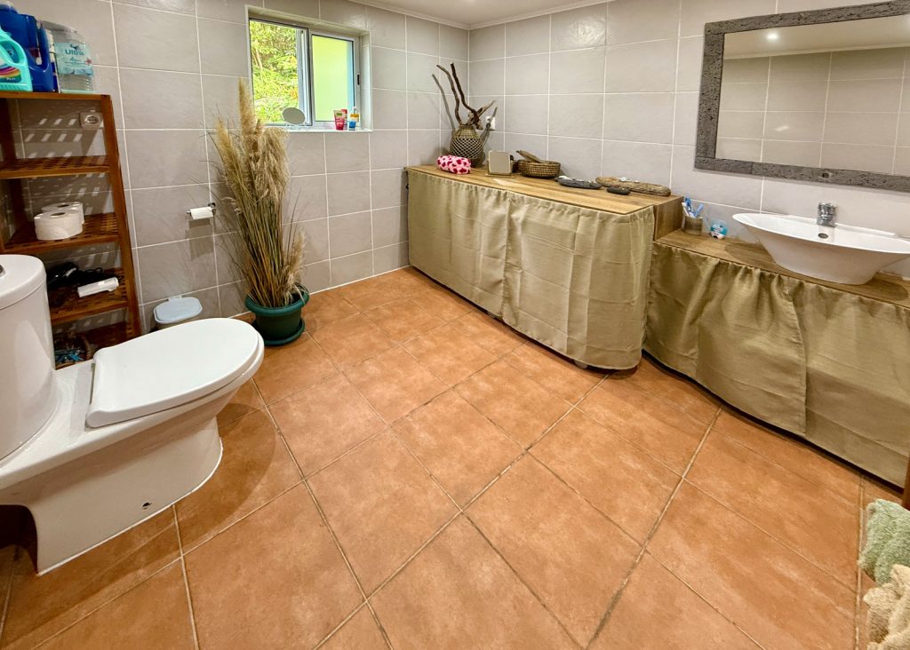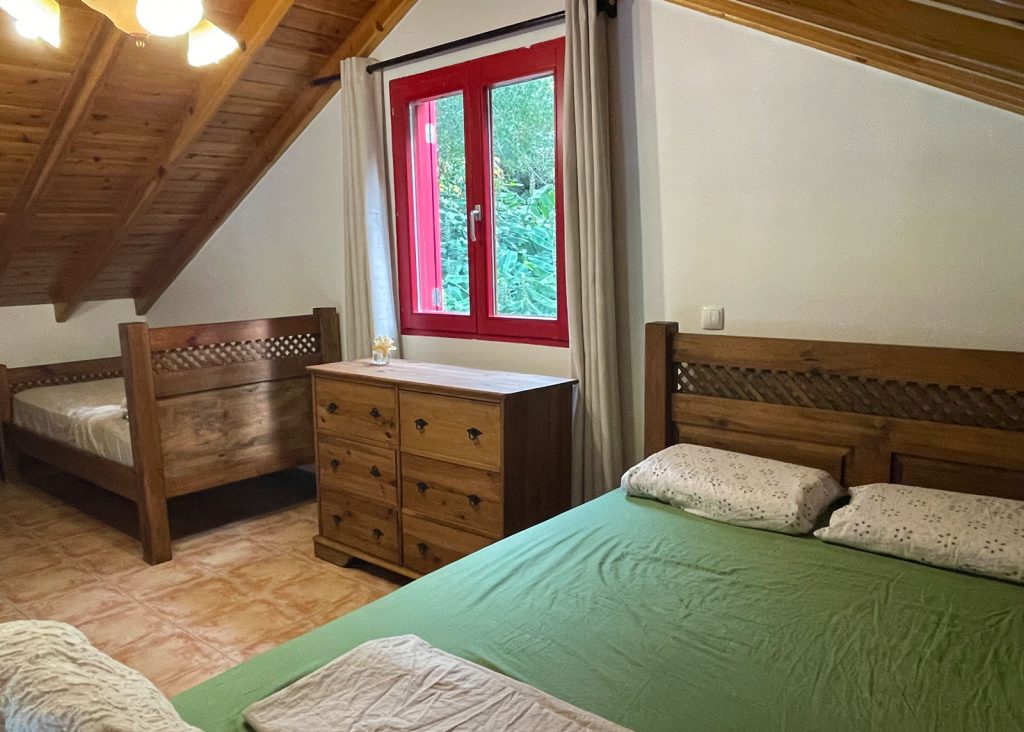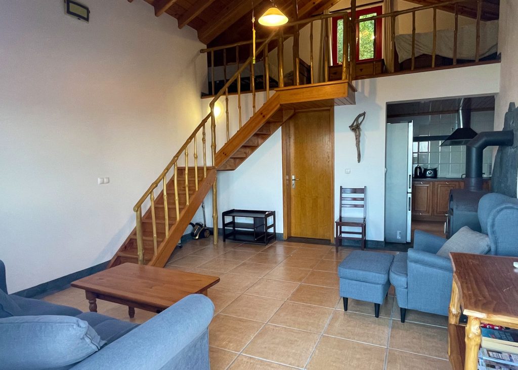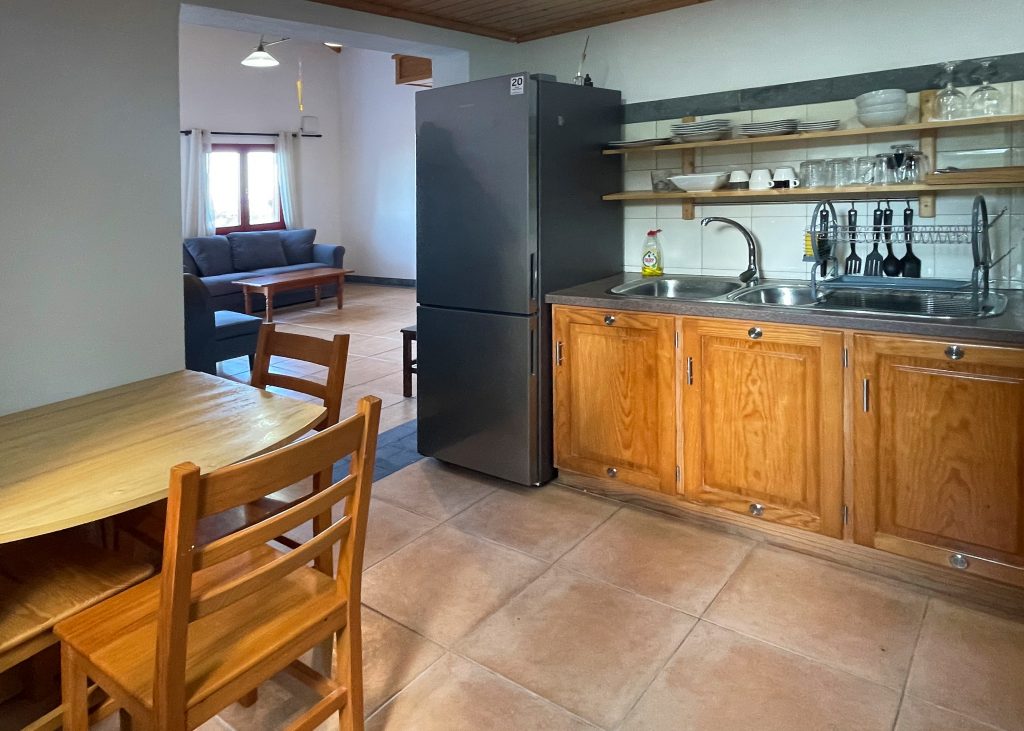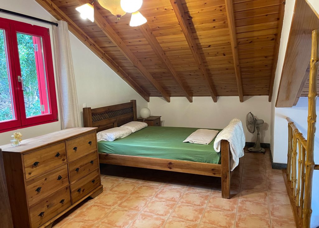 Der Eingangs- und Wohnbereich profitiert von einer hohen Decke, die zur Küche hin offen ist. Auf den zwei Etagen befindet sich oben ein offenes Atrium-Schlafzimmer mit einem Doppelbett und einem Einzelbett und im Erdgeschoss ein großzügig geschnittenes Wohnzimmer mit Kamin und Couch. Vom Wohnzimmer aus gelangt man in die Küche. Ein Esstisch mit Blick auf den Ozean ist ebenso vorhanden. Ein separates Schlafzimmer verfügt über ein gemütliches Doppelbett mit Meerblick. Das große Badezimmer verfügt über eine Dusche, Waschmaschine, sowie alle anderen Annehmlichkeiten. Eine Klimaanlage sorgt an heißen Tagen für Abkühlung.